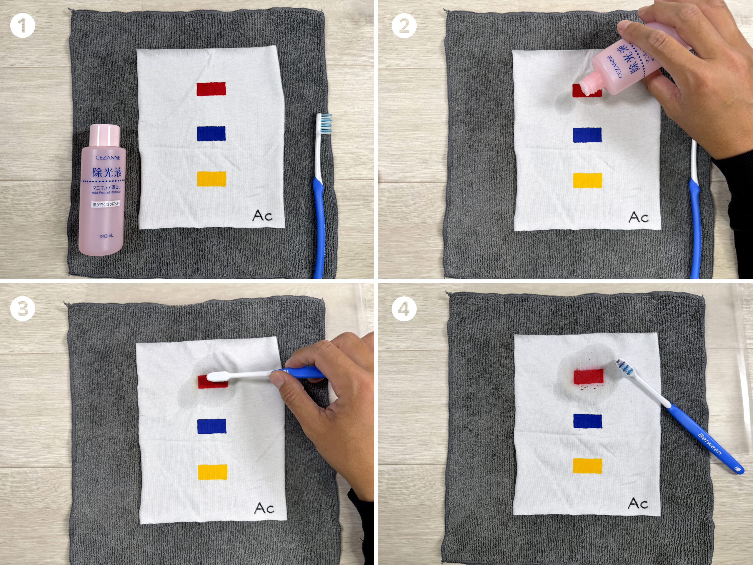除光液は布の表面のアクリル絵の具は取れるが、布に染み込んだアクリル絵の具は残っています。