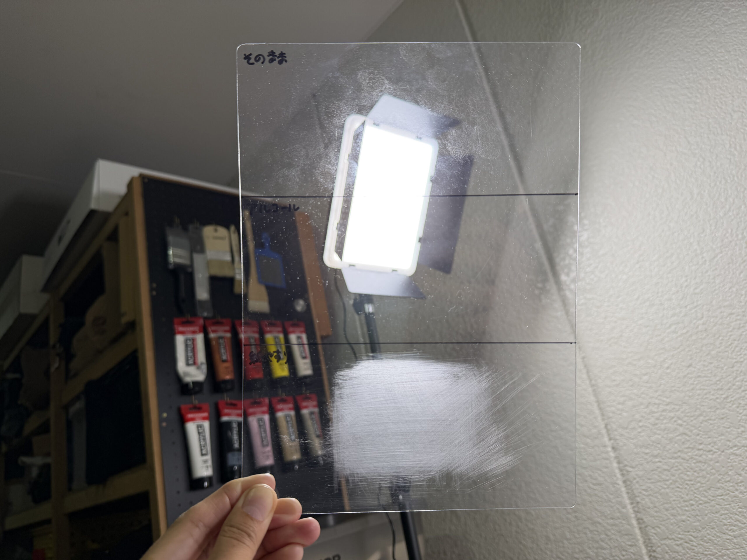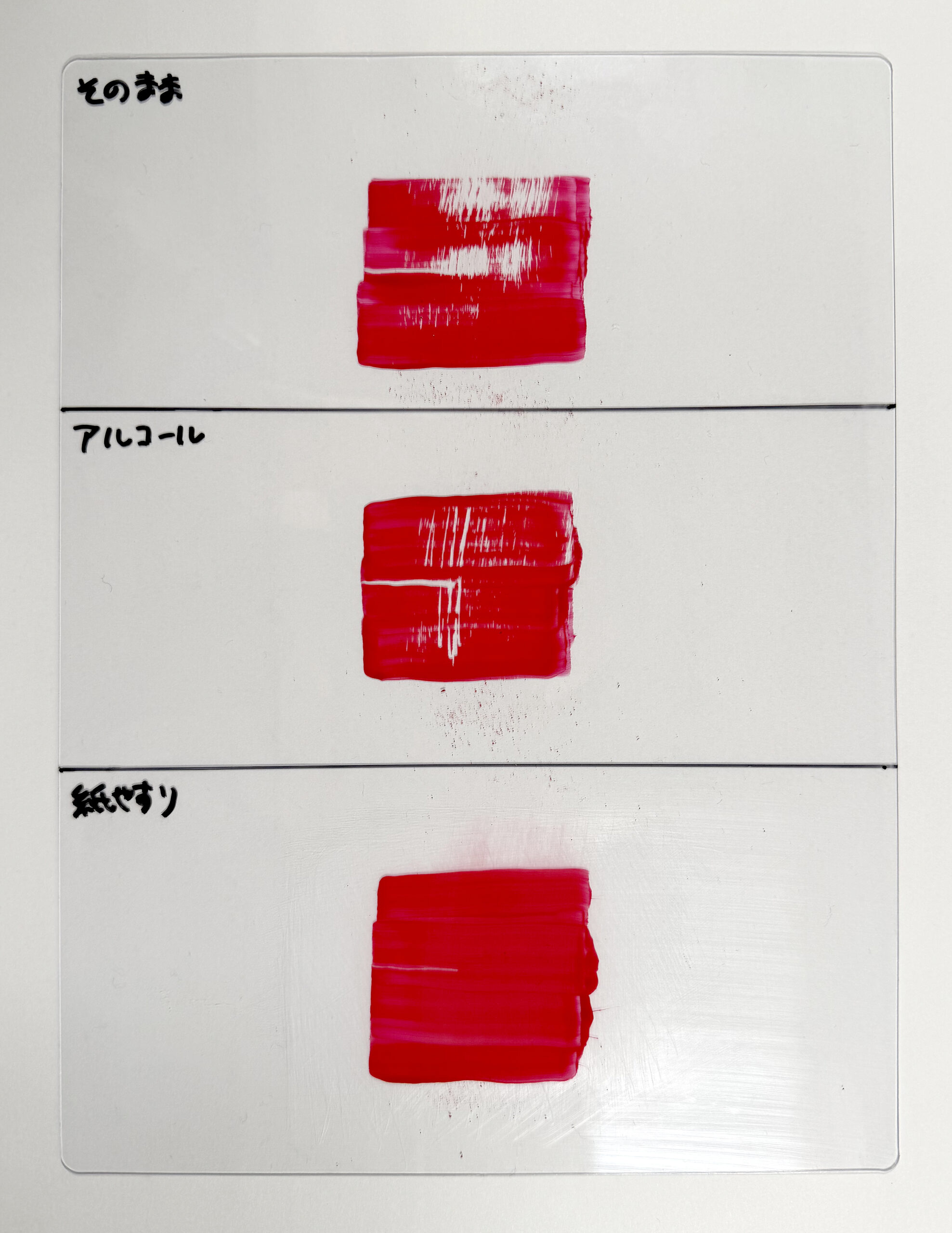 この結果からもプラスチックなどにアクリル絵の具で塗る場合に、表面に細かな傷をつけるのはとても効果的だということが分かります。