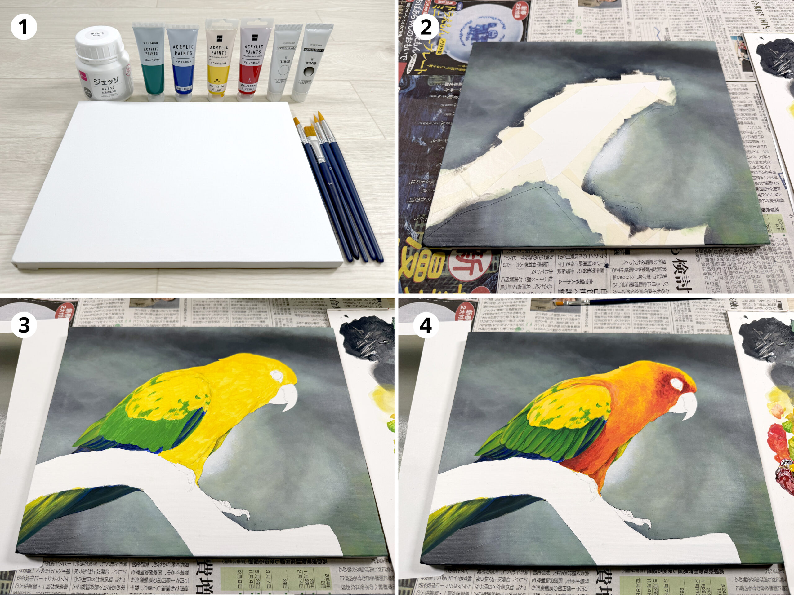 1. 1使用したのはダイソーのアクリル絵の具(赤、黄、青、緑)とセリアのアクリル絵の具(白、黒)の合計6色。キャンバスはダイソーのF3にダイソーのジェッソで下地を作っています。筆もダイソーです。