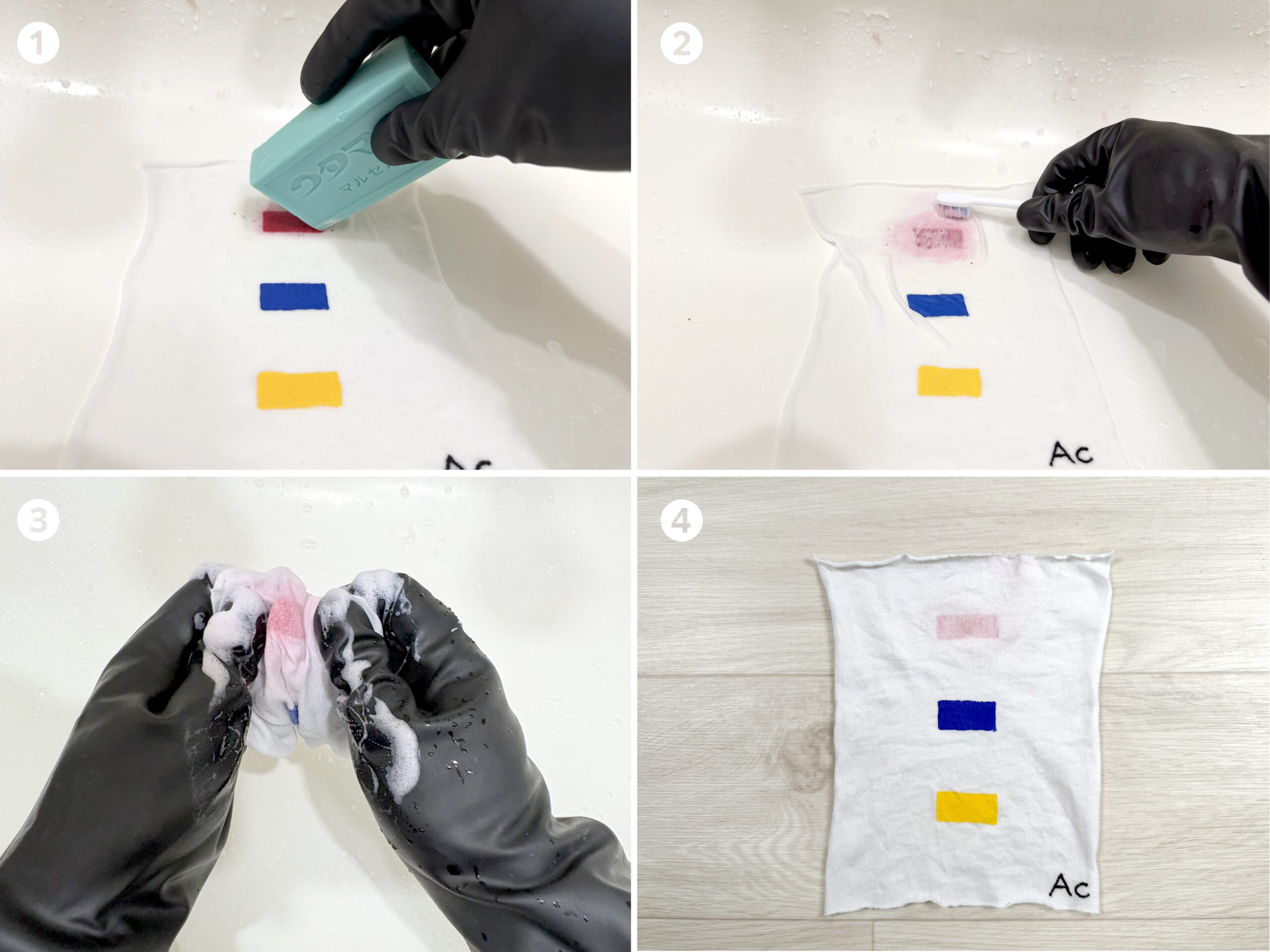 絵の具がまだ湿っている状態なら、慌てる必要はありません。ぬるま湯と普通の洗濯洗剤、あるいは固形石鹸でもみ洗いすれば、ほぼ完璧に落とすことが可能です。
