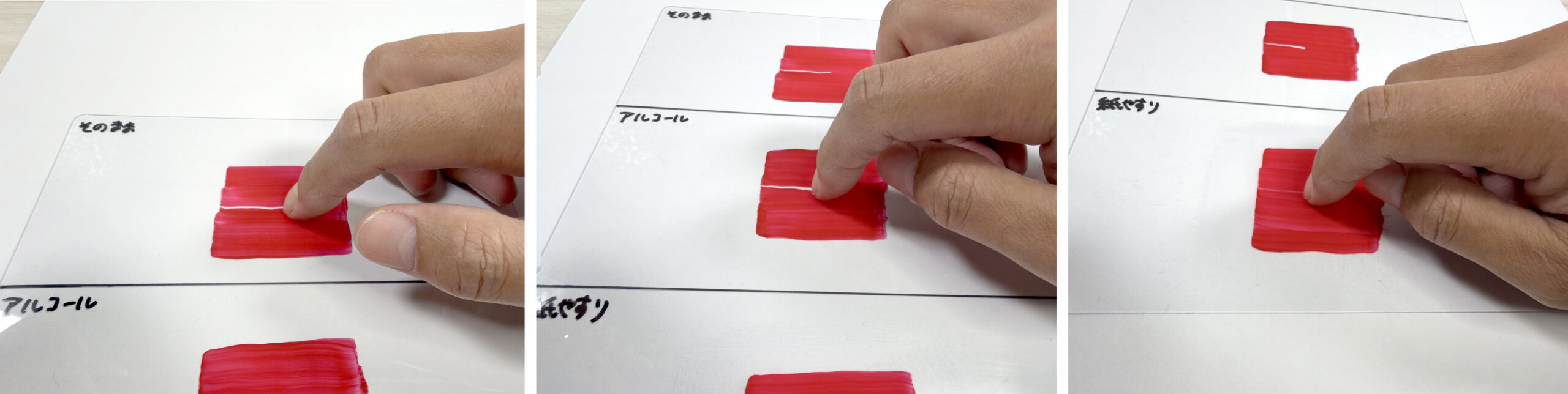 左から皮脂がついたままの表面、アルコール除菌剤で拭き上げた表面、紙やすりで傷をつけた表面