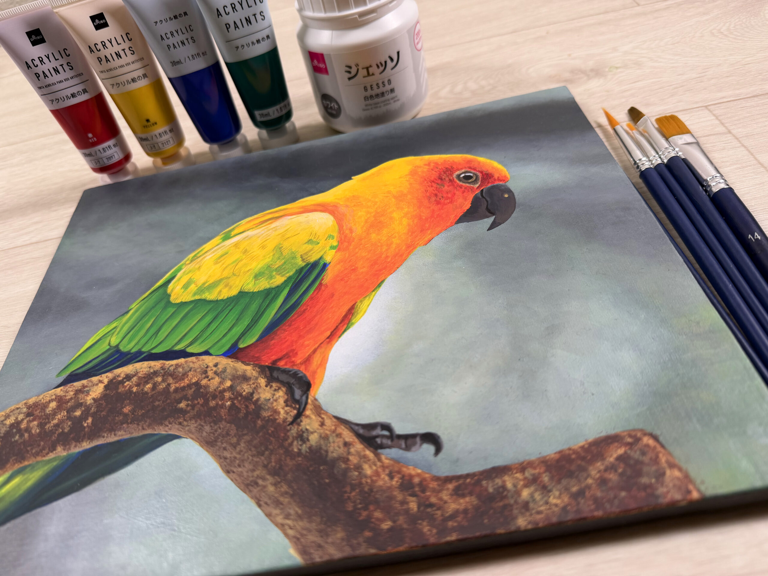 100均画材だけでインコの絵を描いてみました。細い筆は正直使いづらかったですが、工夫すればここまで描けます。趣味には十分な実力です!