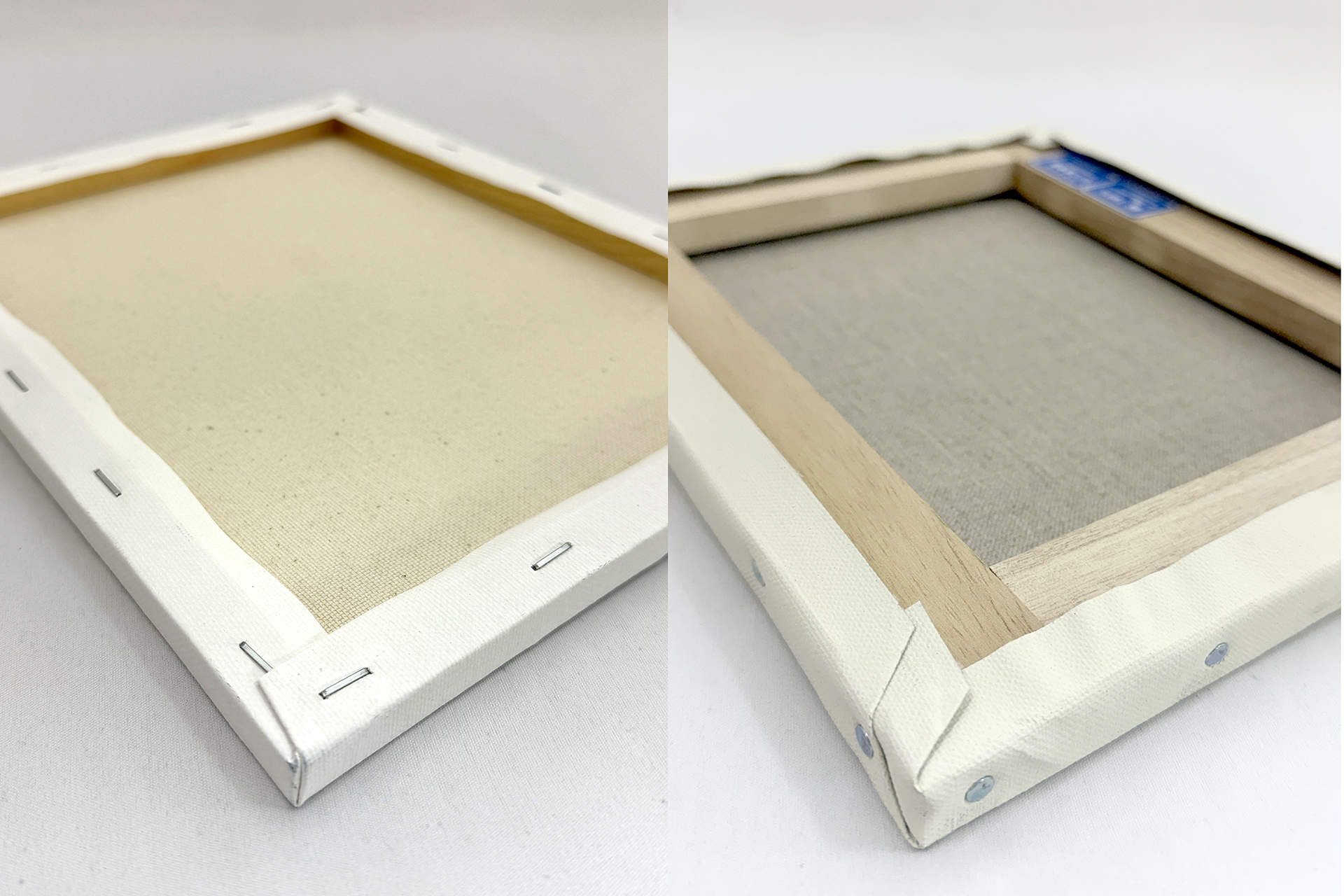 画材店で販売されているキャンバスはメーカーや商品によって異なりますが、今回比較したキャンバスで見てみると、キャンバス地は麻100%で木枠は桐材でした。
