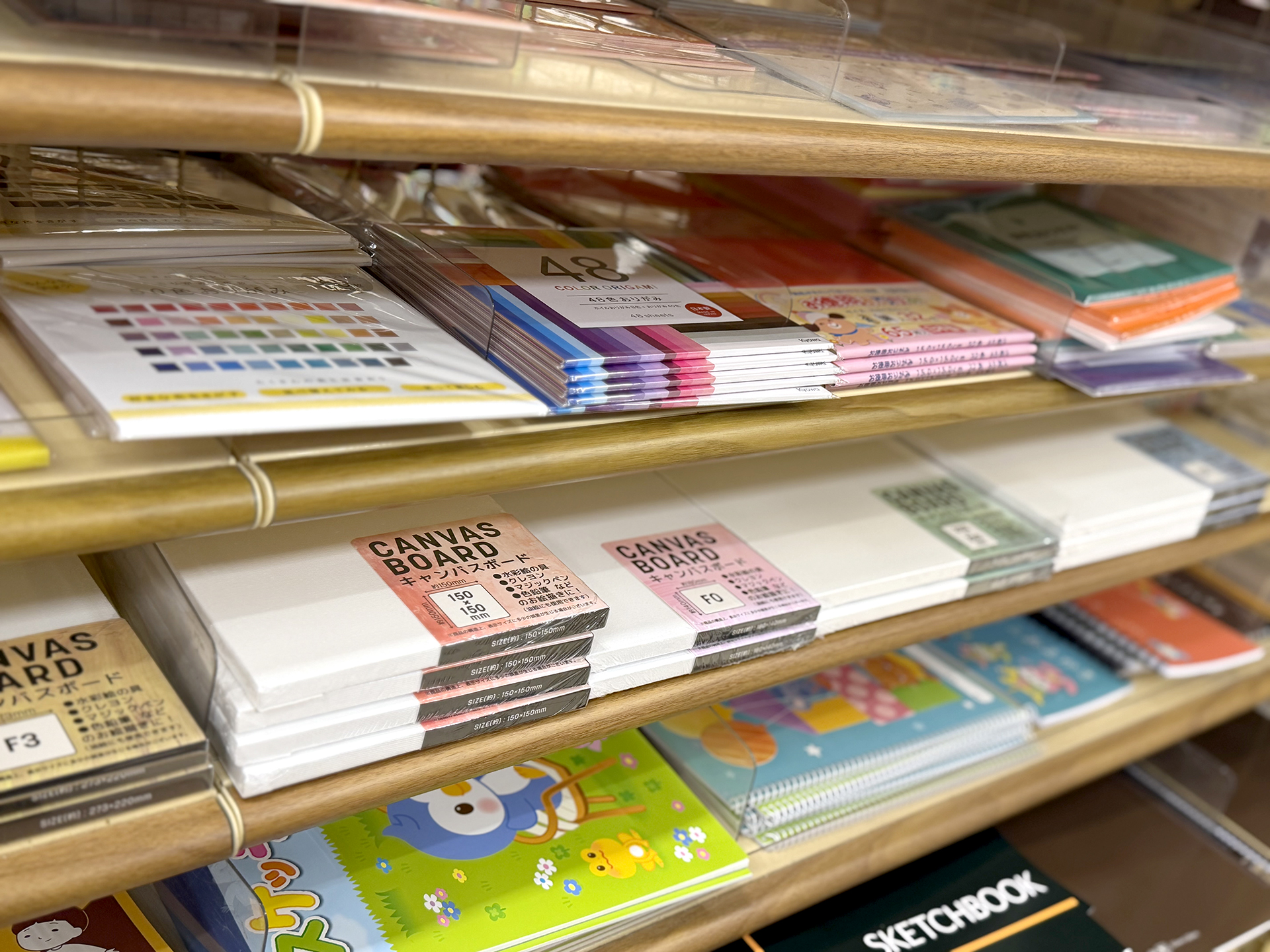 画用紙やスケッチブックに加えてキャンバスも棚に並んでいました。