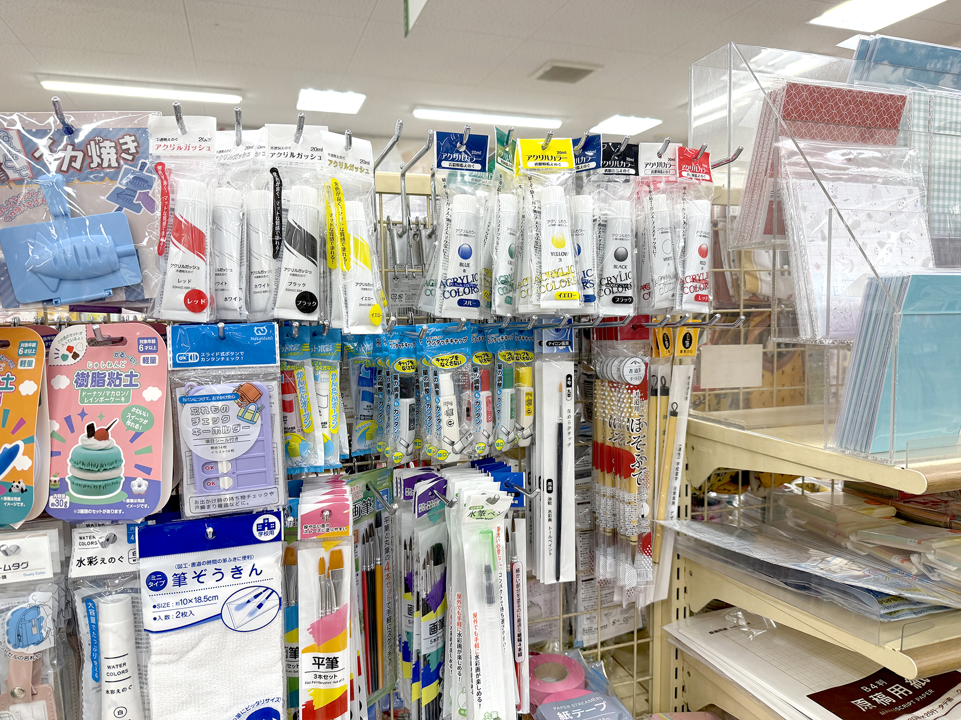 絵の具が並んでいる場所を中心に撮影しましたが、アクリル絵の具の種類が緑、ダークグリーン、グリッターブルー、グリッターレッド、グリッタークリアの5種類しか置いてありませんでした。(たまたま在庫が少なかっただけかもしれません)