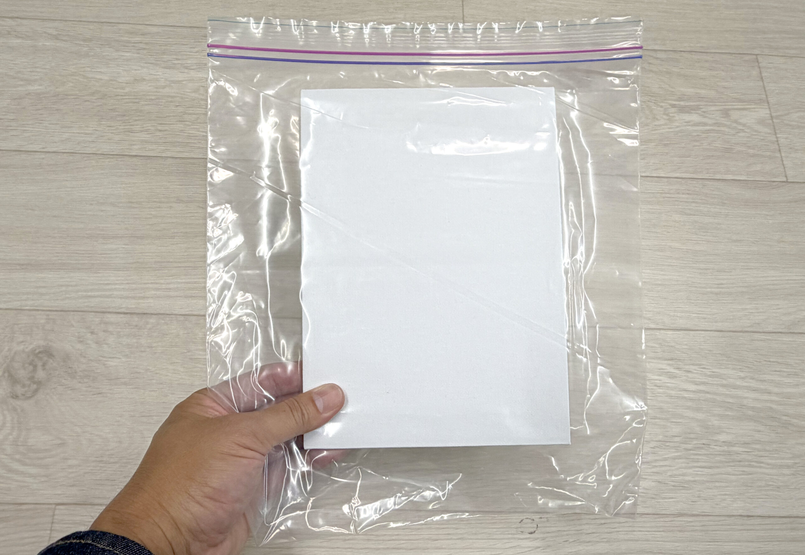 今回はダイソーのキャンバスパネル(220mm×160mm)と同じくダイソーのフリーザーバッグL(270mm×285mm)を用意しました。