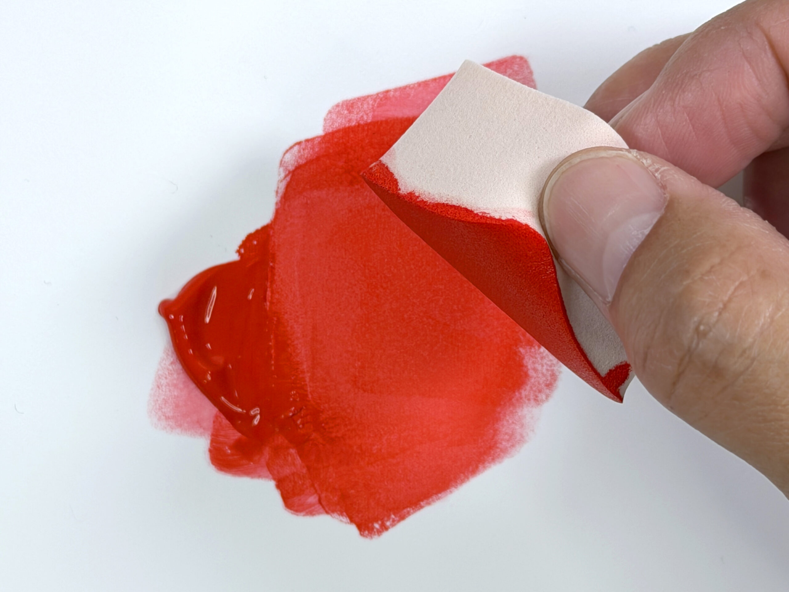 筆の場合、色と色の境界線を「撫でる」ように馴染ませますが、スポンジは上から「叩く(タップする)」ことで、異なる色の粒子をランダムに混ざり合わせます。