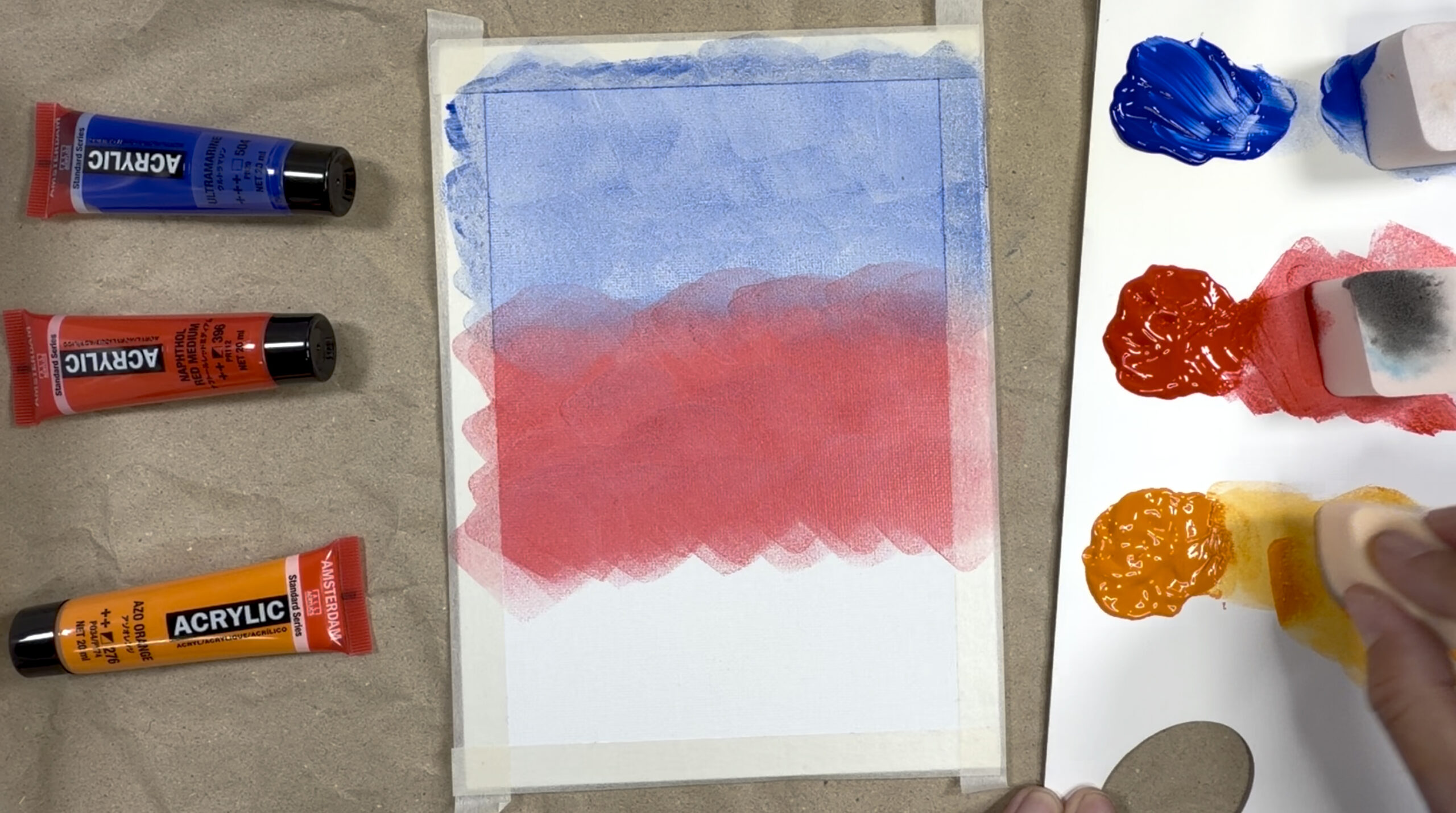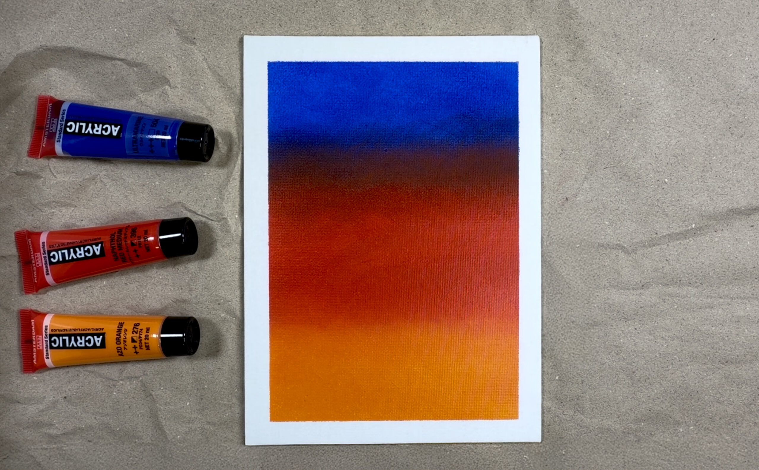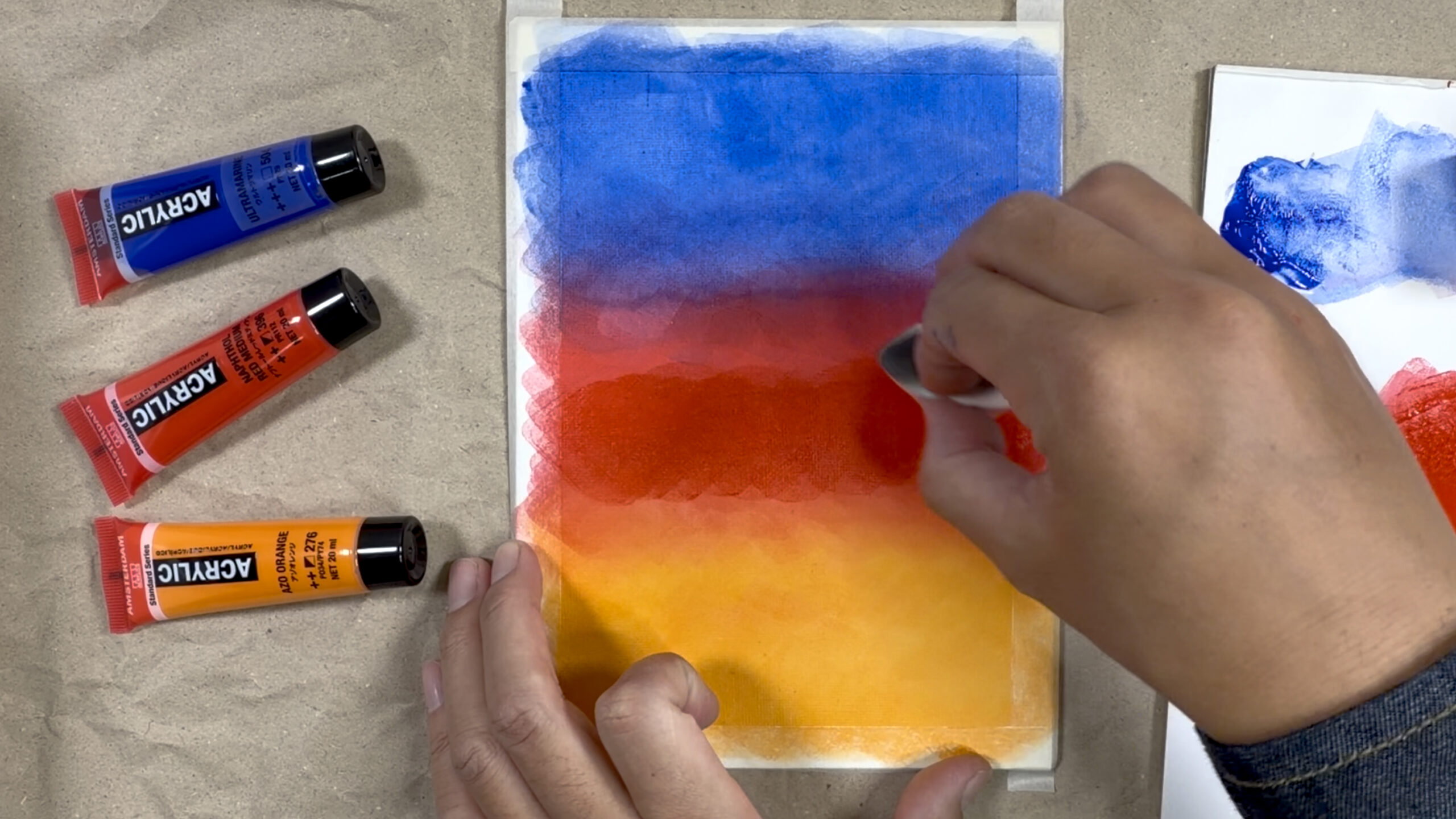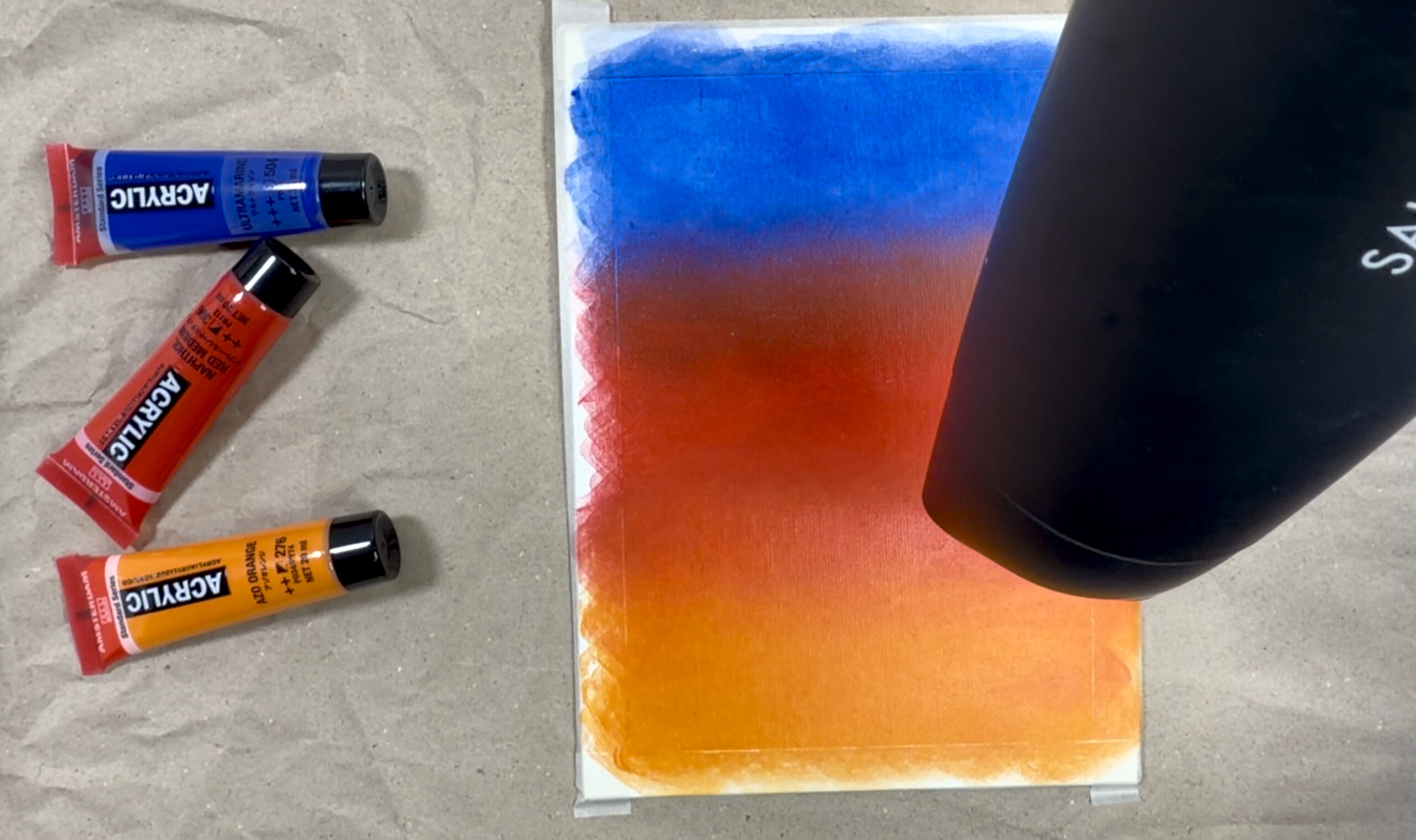 アクリル絵の具は乾燥が速いため、筆だけで滑らかなグラデーションを作るには高度な技術が必要です。