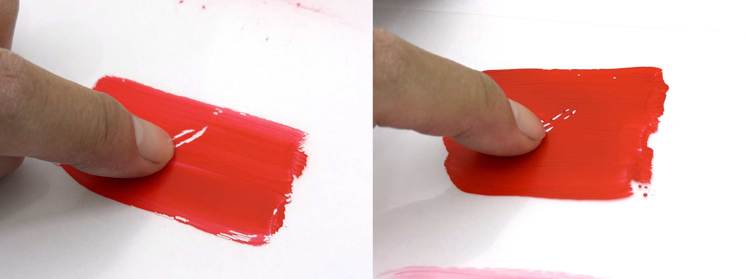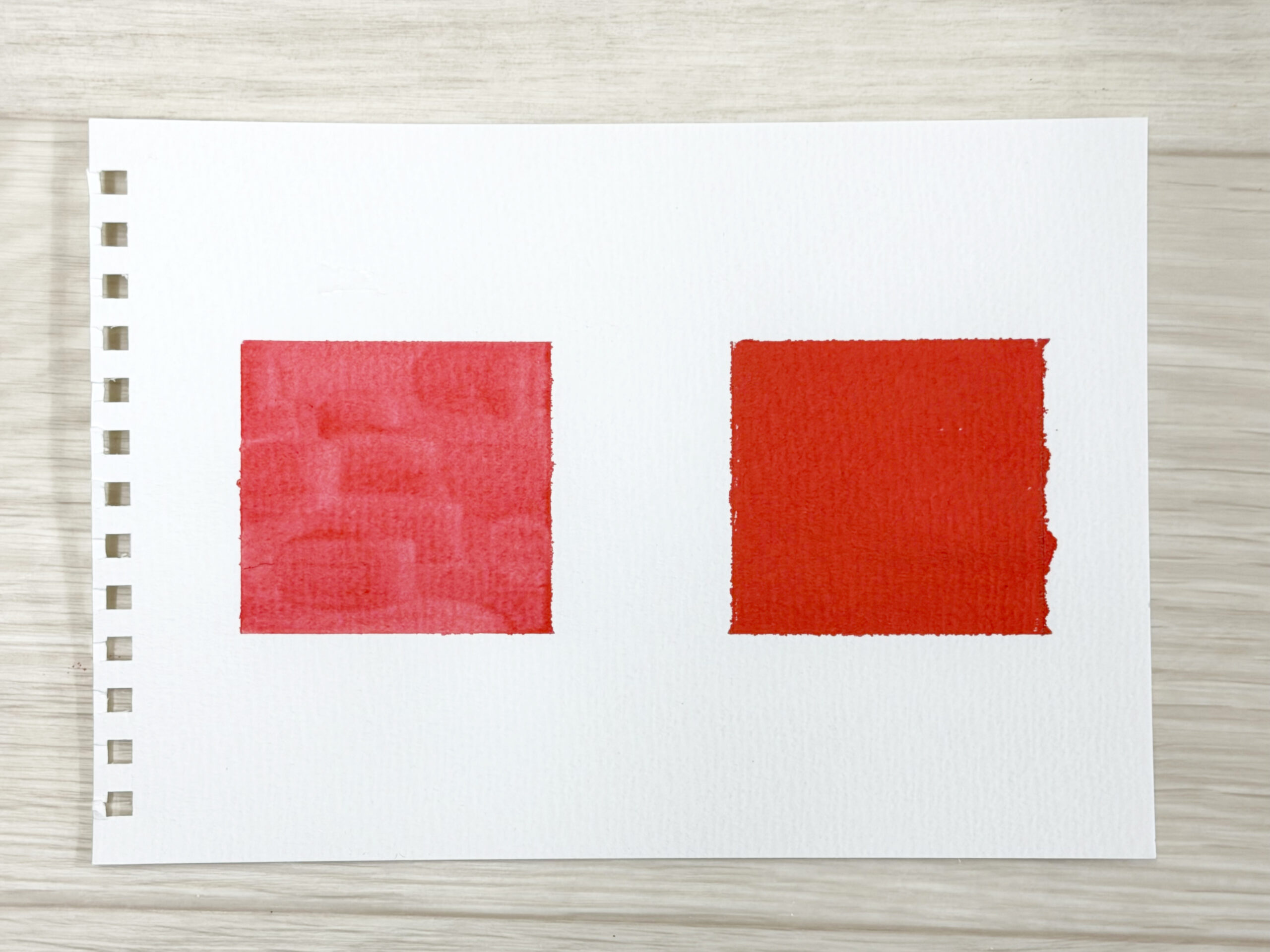 実際に多めの水(アクリル絵の具と1:5程度の牛乳くらい)で薄めたアクリル絵の具と10:1程度の水で薄めたアクリル絵の具を塗って比較してみました。
